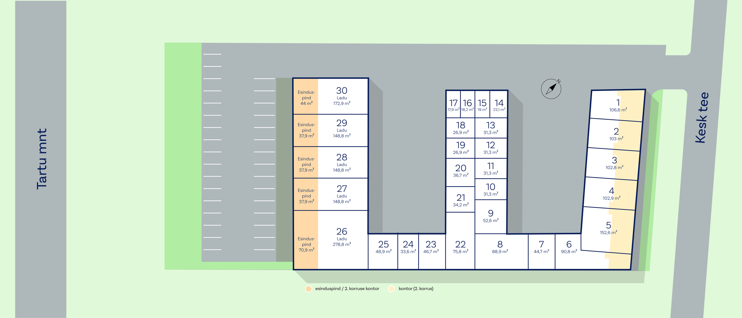 Kesk tee 30 laod on 2026. aasta kevadel Jüri Tehnopargis valmiv laokompleks, mis pakub linnalähedast ladustamiskohta sinu tootmisettevõttele või hobidele, mis koju ära ei kipu mahtuma.