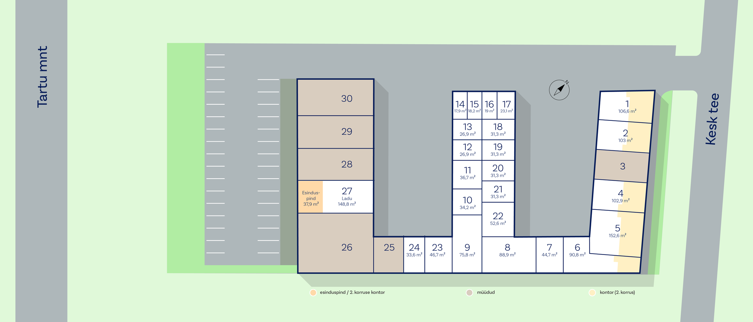 | Ladu nr | Laopind (m2) | Esinduspind (m2) | Kontor (m2) | Hind (+km) |